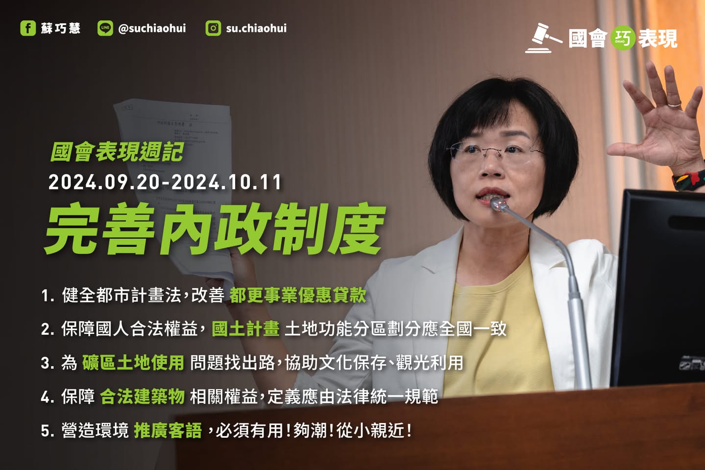立法院從開議至今已經滿一個月,本會期的委員會從9月底選出召委之後,每天都有滿滿的議程,我也跟大家報告,過去這一個月,我們針對不同議題都提出質詢,要求讓「國土計劃國土功能分區」更加完善、健全都市計畫法制,甚至是營造更友善的客語學習環境。