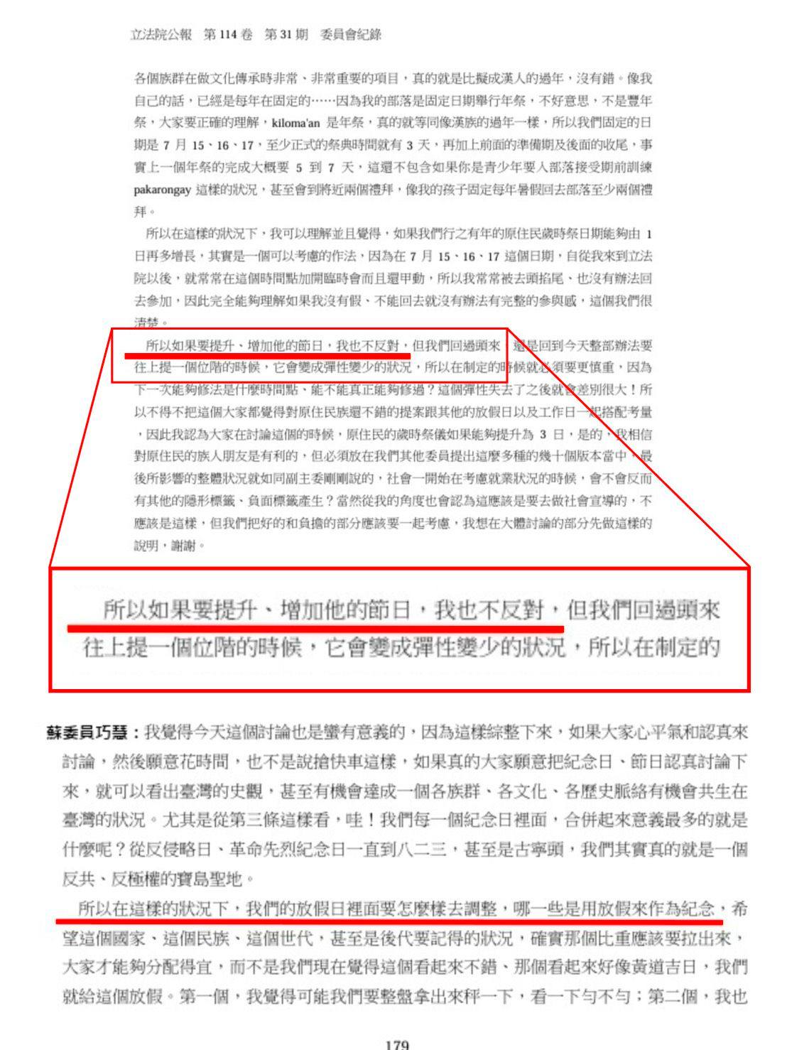 我在質詢、審查法案時一直強調,我們不反對放假,但紀念日及節日代表的是國家的歷史脈絡以及中心價值,因此更需要各界的討論。很可惜的是,今天藍白兩黨再次用修正動議的方式,在最後一刻修改委員會明明已討論過有共識的條文,硬要塞進光復節,讓委員會的審查和結論如同虛設。