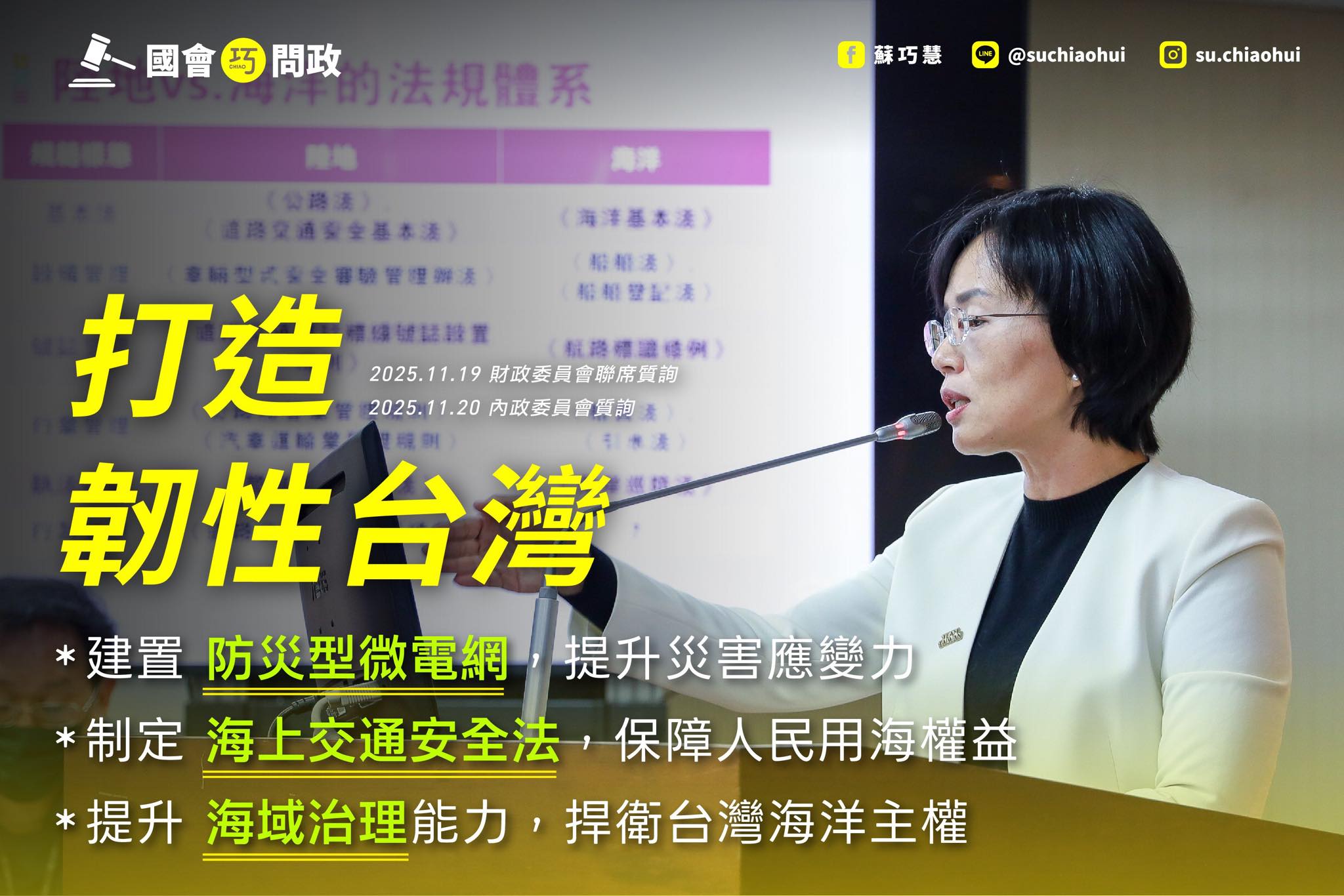 我向內政部爭取儘速提供經費,希望加速推動防災型微電網,提升社區的防災韌性。我呼籲海洋委員會可以制定一部適合台灣的《海上交通安全法》,保障所有用海、親海的人民,讓每位朋友都能安全、安心的親近海洋、向海致敬,也希望能夠幫助主管機關在捍衛海疆時執法有據,為第一線海巡同仁提供最堅實的後盾。