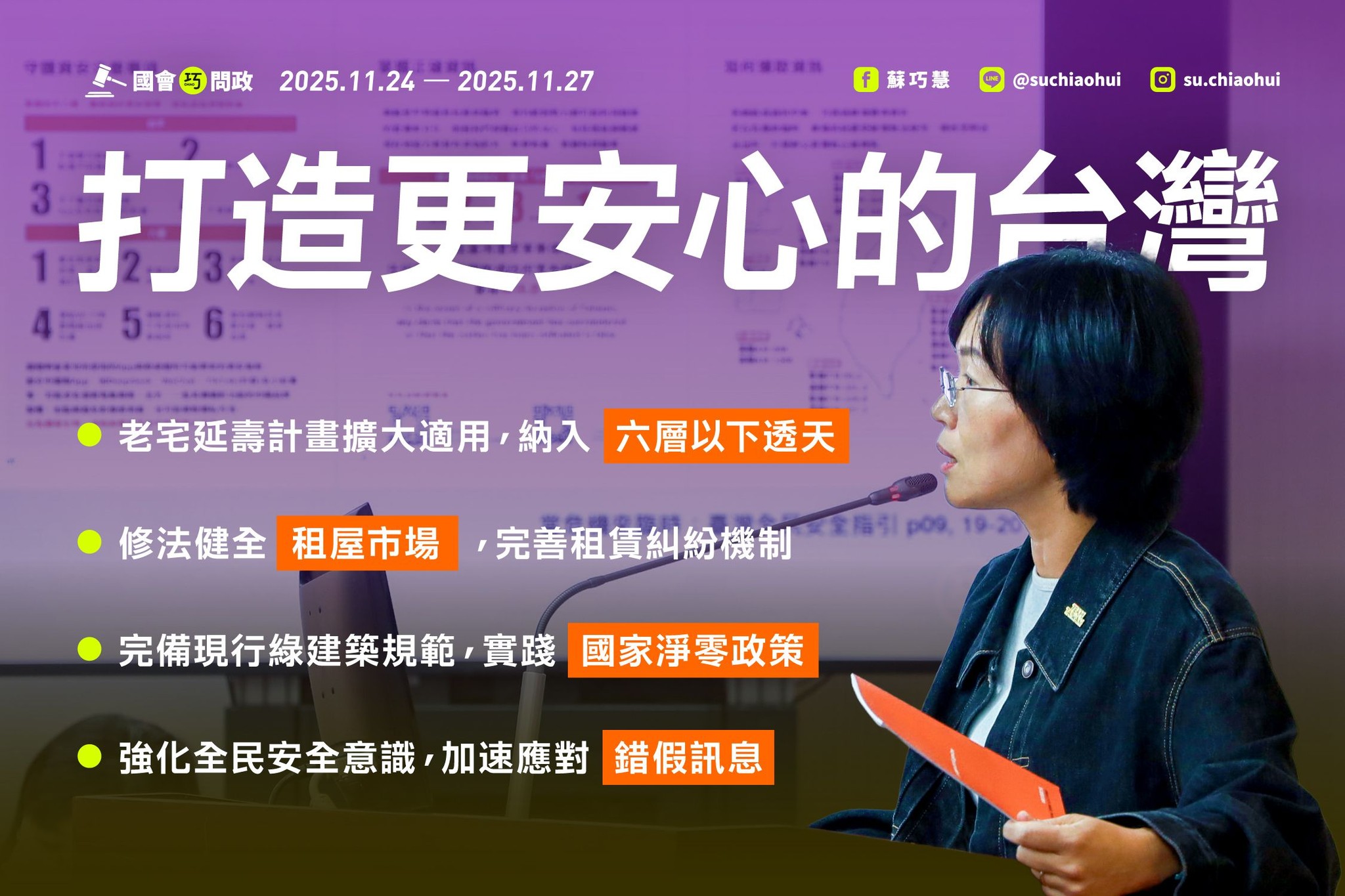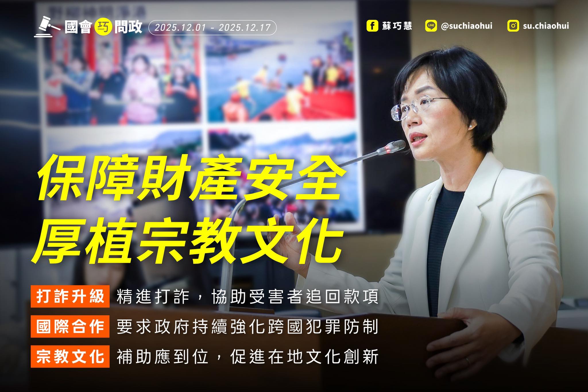 這段時間,我不但在地方衝衝衝,在國會也一直針對各項議題,緊盯行政機關,從強化打詐、防制跨國犯罪,到促進宗教文化創新,每一項我都要求政府部門可以有更積極的行動,也跟鄉親們報告三項重點…