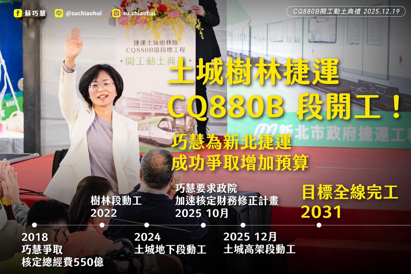 捷運土城樹林線再向前邁出一大步!自從我上任立法委員以來,我一直不斷透過多次質詢、會勘,努力推動土城樹林捷運,也在2018年成功爭取行政院核定總經費555億的計畫。