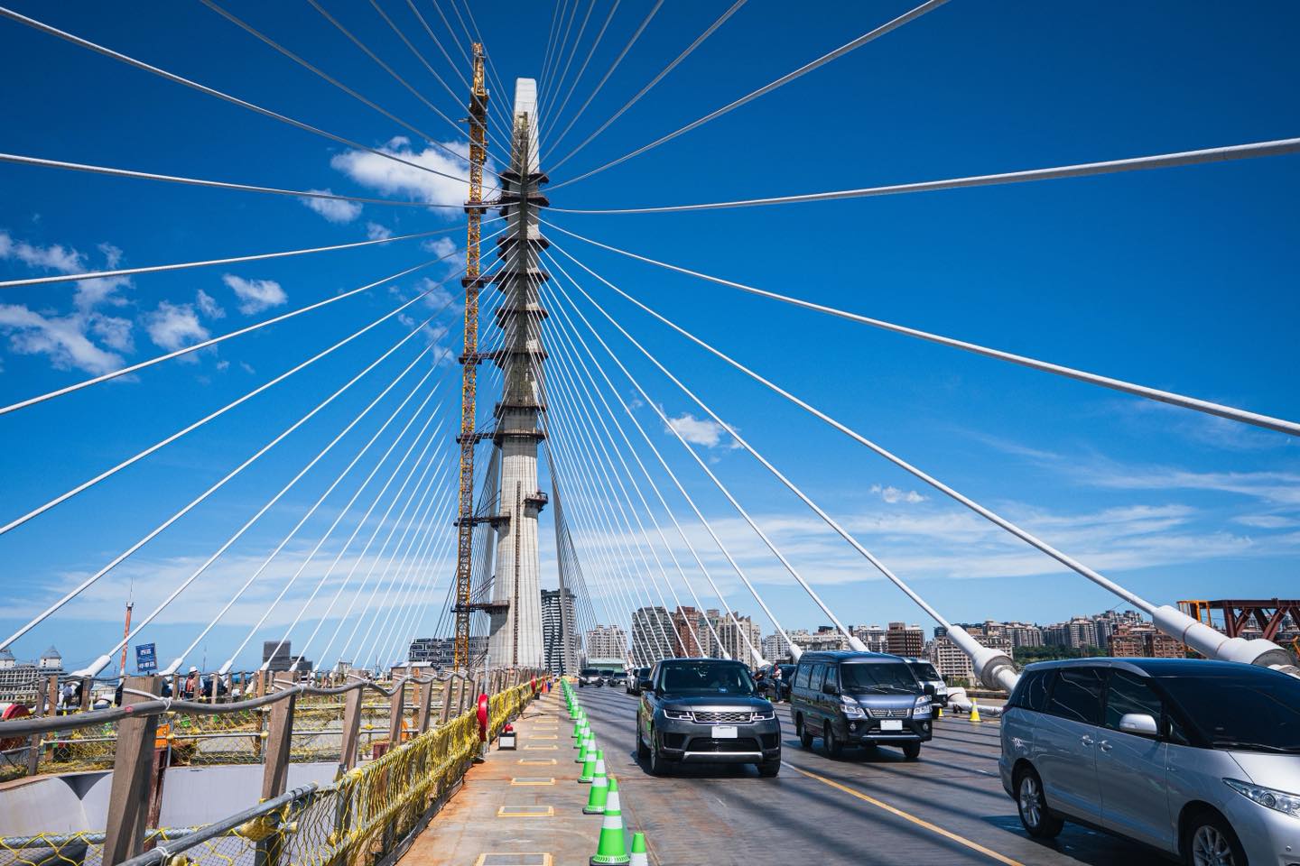 感謝中央行政團隊一棒接一棒的努力,和交通部公路局以及所有第一線工程人員日以繼夜堅守工作崗位、把關施工品質,還有新北市府通力合作,才能一步步完成這項世界級的浩大工程。不只淡江大橋,接下來包括淡北道路、關渡新橋、淡海輕軌、八里輕軌等等,中央會持續積極建設新北交通,中央、地方協力合作,讓新北發展越來越好!