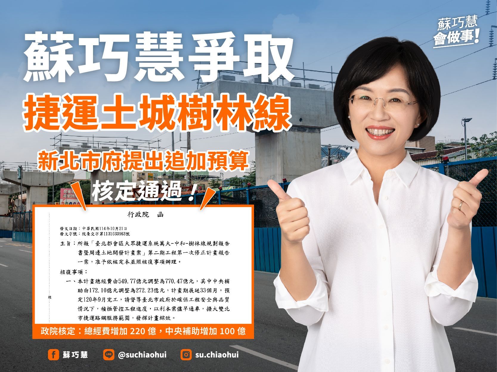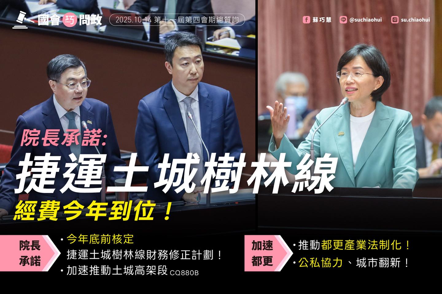 目前動工中的捷運土城樹林線工程CQ880B土城高架段,因應新北市政府提出追加預算的需要,我在上週利用總質詢的時間,和卓榮泰院長當面爭取,希望加速核定捷運土城樹林線的財務修正計劃