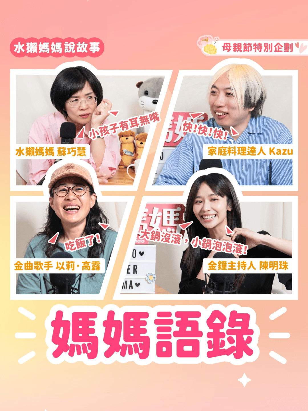 這次母親節,我特別邀請了三位來自不同文化背景的朋友:金鐘主持人 陳明珠、金曲歌手 以莉.高露、日式家庭料理達人 Kazu 來分享他們媽媽的招牌台詞、成長時的溫馨回憶,以及不同文化中表達母愛的方式!