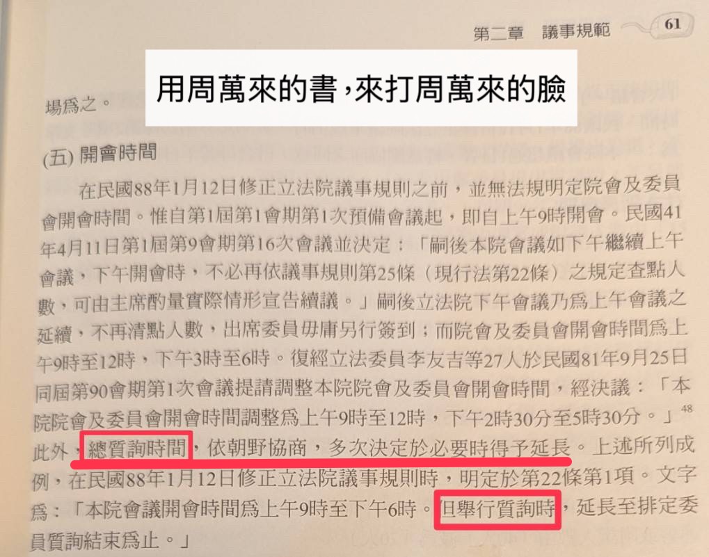 但根據立院秘書長周萬來自己所寫的「議案審議」/立法院運作實況第61頁,當初訂22條,就是為了總質詢時間,所以引用22條的情境應當是進入總質詢的時候。