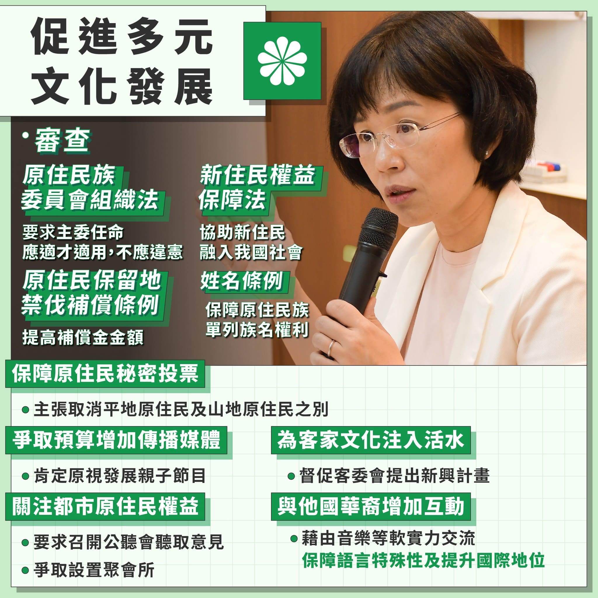 本會期的總質詢,我除了追蹤政府對於保障台語、客語、原民語、馬祖閩東語等國家語言的政策進度外,也特別建議文化部應在音樂文化等軟實力上加強與他國華裔的交流。臺灣因於國際地位上的特殊性,臺灣有的各種語言亦無法在國際上保有自身的特殊性或能見度。若藉由與他國在音樂文化上的交流,讓華語屬於各國之語言的事實現況在國際上被普遍認同,就能夠提升台灣文化於國際地位之能見度!