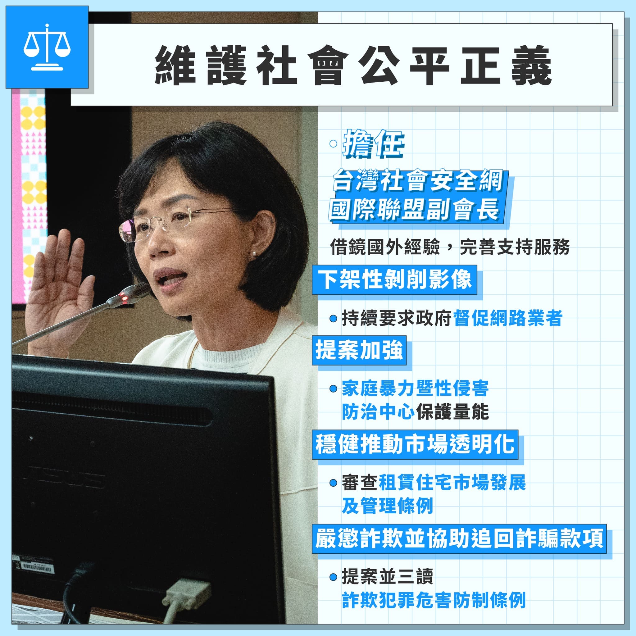 社會安全網真正落實是在蔡英文前總統及執政團隊的努力之下,才開始逐步推動,而在時任行政院長賴清德時,投入了70億元成立社會安全網第一期,後來前行政院長蘇貞昌院長更增加了六倍預算,超過400億元至第二期計畫,照顧到最需要幫助的民眾。兒少福利及社會安全網一直是我非常關心的議題,上一屆我在衛環委員會時,也提出許多相關法案並獲三讀,包含制定跟蹤騷擾防制法、修正家庭暴力防制法等等,很榮幸在本屆能獲邀擔任台灣社會安全網國際聯盟副會長,我們將繼續與各社福單位、第一線的工作者溝通,匯集產官學界的力量、借鏡海外經驗,共同加強社會安全網的韌性,撐住每一位最需要幫助的國人。