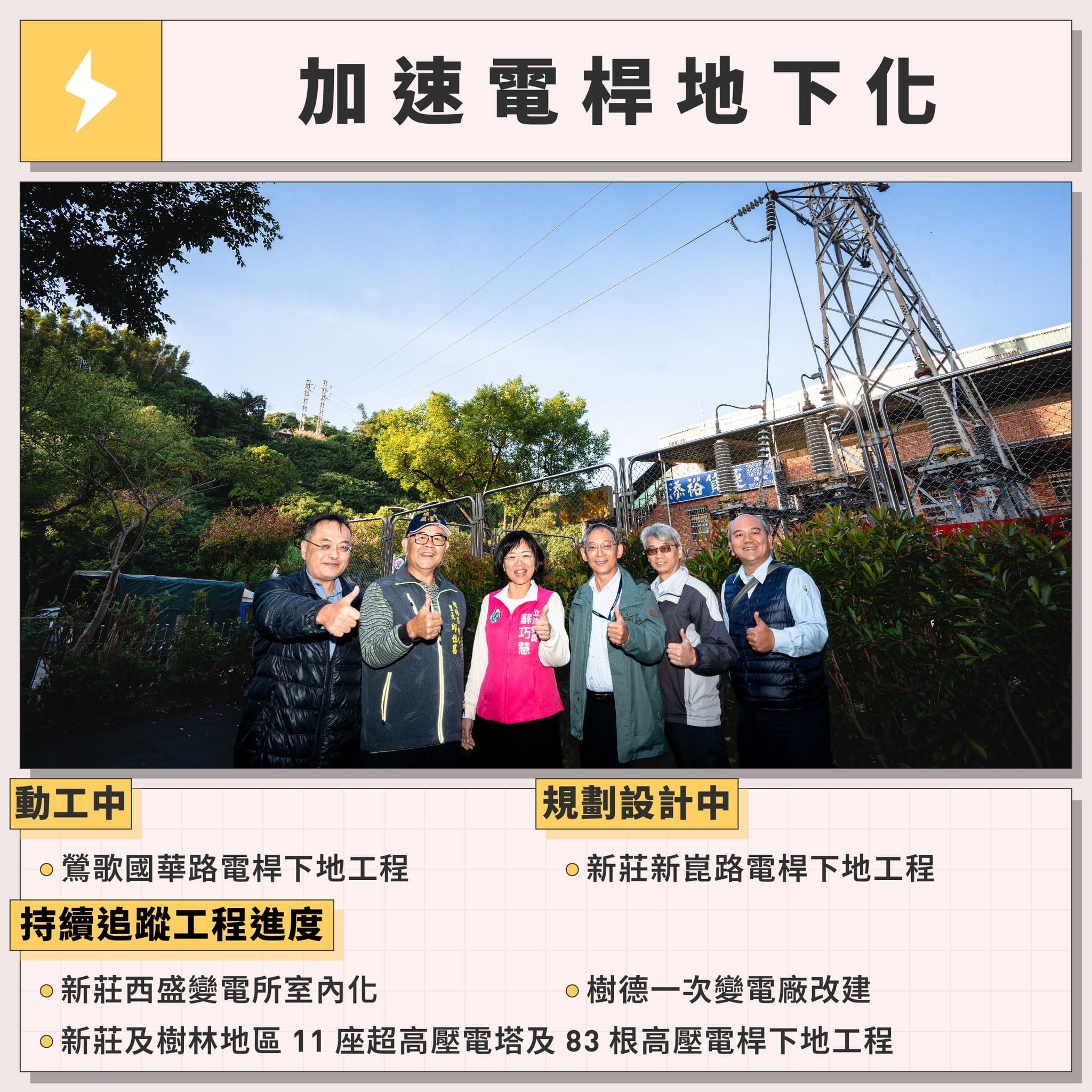 地表上一根根的電線桿,雖然為我們帶來不可或缺的電力,但對來往的行人造成很大的困擾,也讓在地的市容蒙上一層灰。我從上任以來,就積極爭取選區內的電桿地下化。除了新莊新崑路與鶯歌國華路的電桿下地工程要繼續進行,我也要求配合捷運樹林線的施工,把新莊、樹林的超高壓電塔與高壓電桿也一併下地並持續推動西盛變電所室內化,將工期對鄉親的影響降到最低。