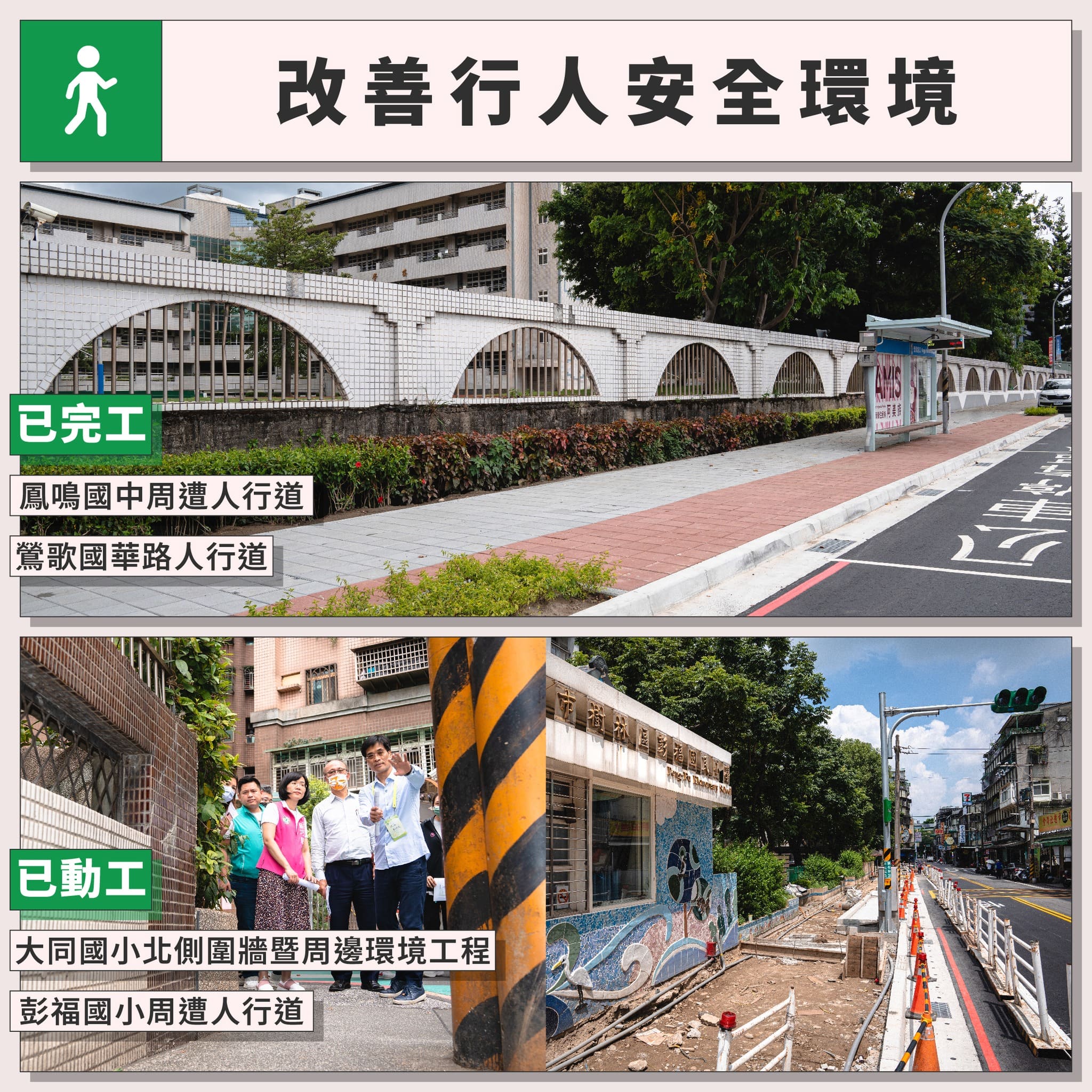 通過《行人交通安全設施條例》之後,中央會依法積極輔導地方政府劃定行人友善區、行人優先區等區域,並透過4年400億的計畫,從基礎工程面著手,優先改善行人通行環境。