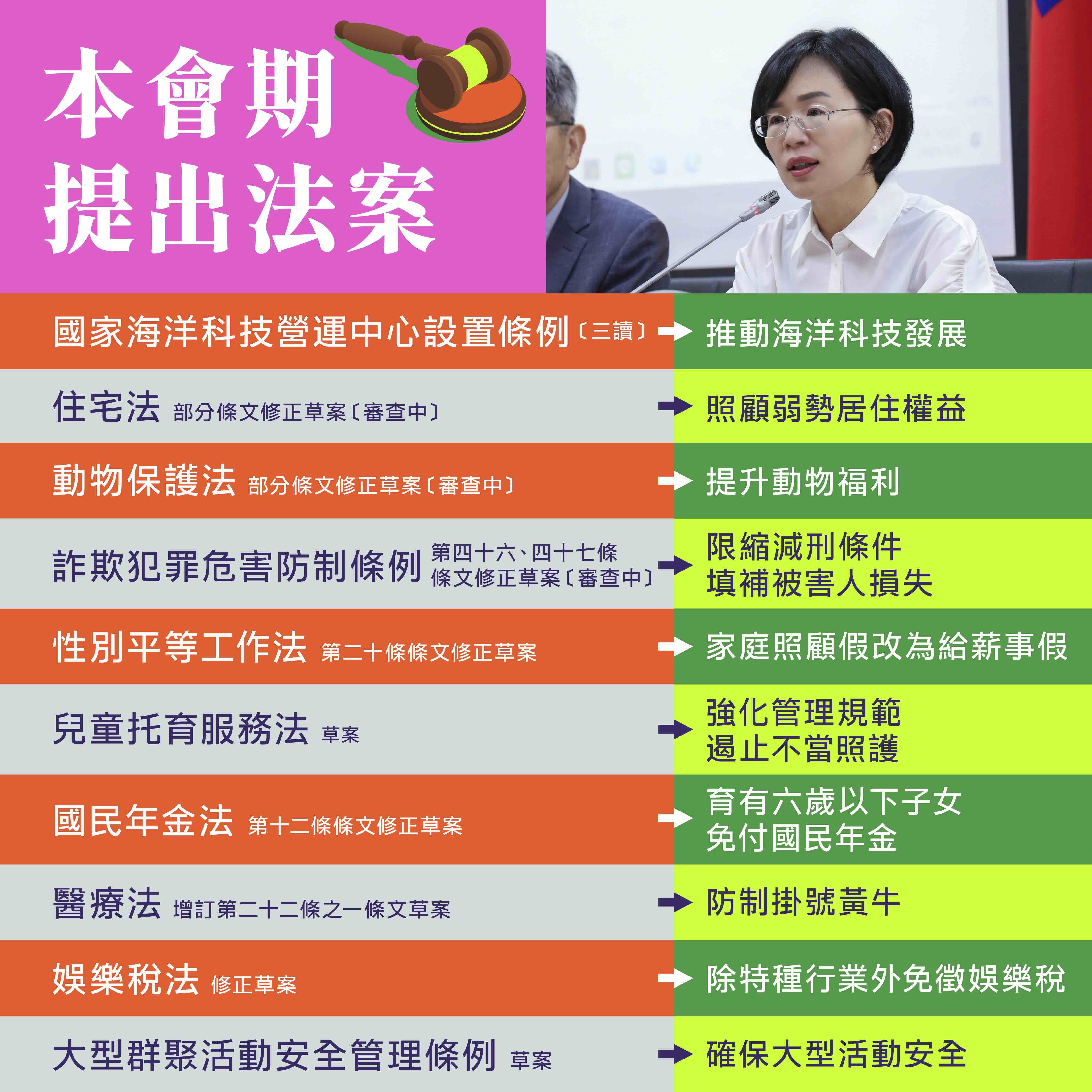 本會期我提出了9個法案,其中1案已獲三讀,也有3案正在審查中。未來我仍會秉持著「更好的法制、更好的台灣」的精神,持續研議並提出更多福國利民的法案。