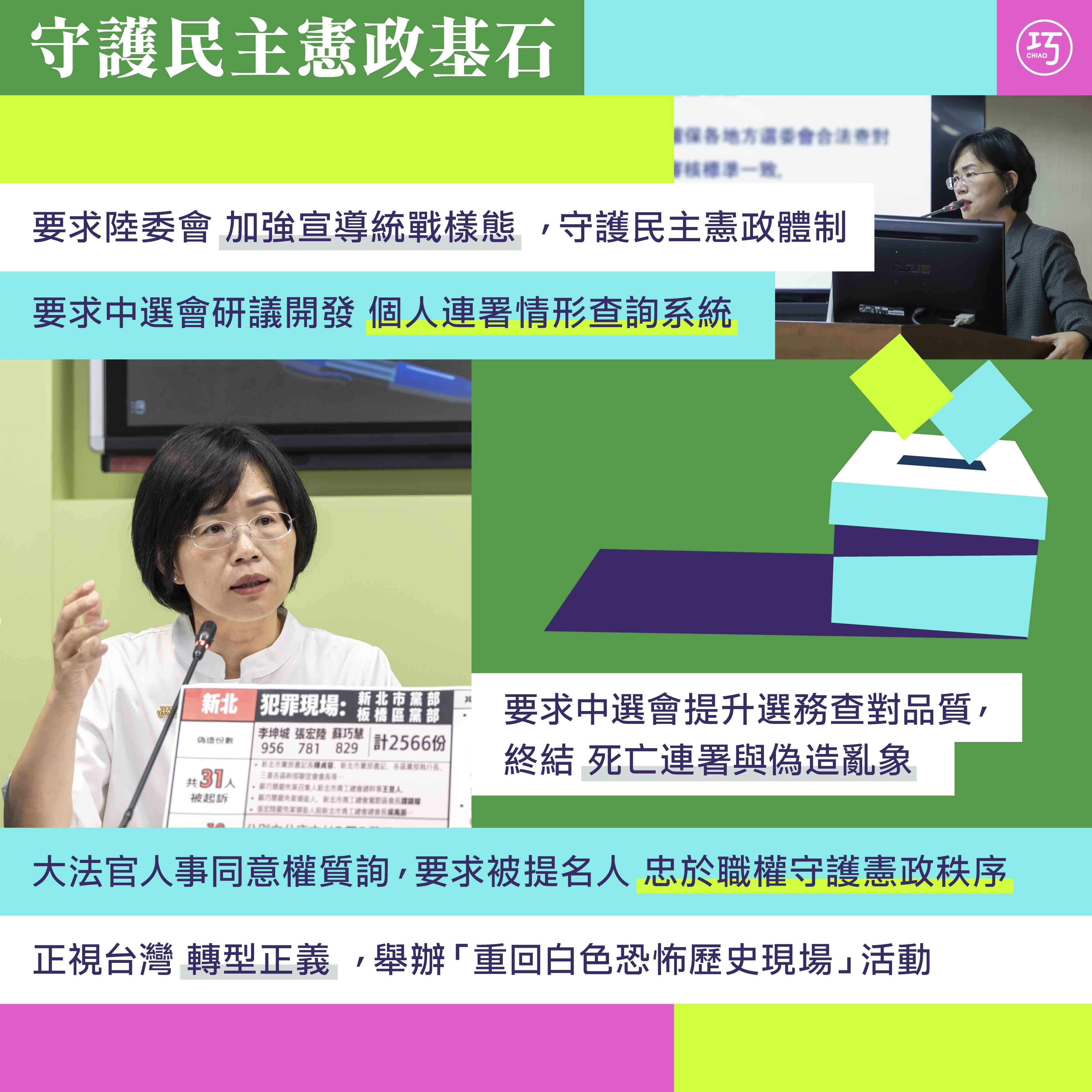 台灣的民主與開放,是經過無數前輩的奮鬥,爭取到公平、公正的選舉、罷免與公投制度,才得以成為亞洲的民主燈塔。台灣的民主制度是否能繼續延續,很大程度仰賴社會大眾對於選務制度的信任:相信各種選務能做到公正、公平,讓每個人都能夠自由地表達意見並做出決定,而不會受到少數有心人士或團體的操弄。但歷年罷免案或公民投票案的連署,都有部分案件出現相當高比例的死亡連署或是偽造等情形。而今年的罷免案有超過120萬人民參與連署,也在基隆和花蓮都發生過戶政和民政機關查水表的荒唐情況。因此我也敦促選委會,在查對作業上應以更高規格、審慎的方式處理,除了全國統一的查對規範準則SOP要建立、要檢討外,也應該特別注重人民的個資保護。