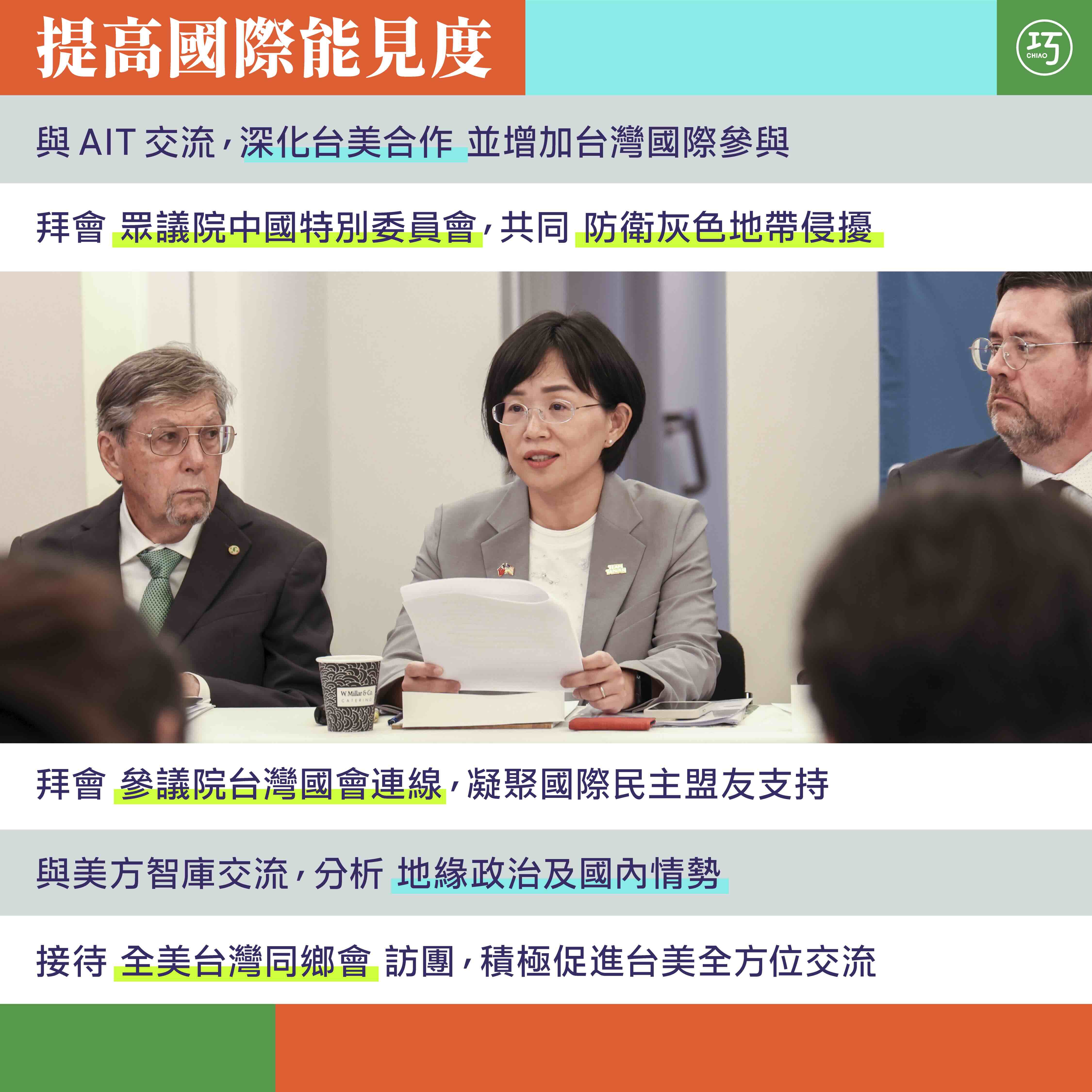 拜會參議院台灣國會連線的交流中,我們針對國防韌性、能源、國際空間等議題進行了多方的交流。如同眾議院給予台灣跨黨派的支持,參議院也同樣對於台灣議題十分重視,會議中我們也針對許多友台的法案進行討論。我也多次強調我們守護台灣、維護區域和平的決心,並重申台灣在地緣政治、經濟等層面的重要性。期待能夠和美國國會有更多方面的合作,具體實踐國會外交!