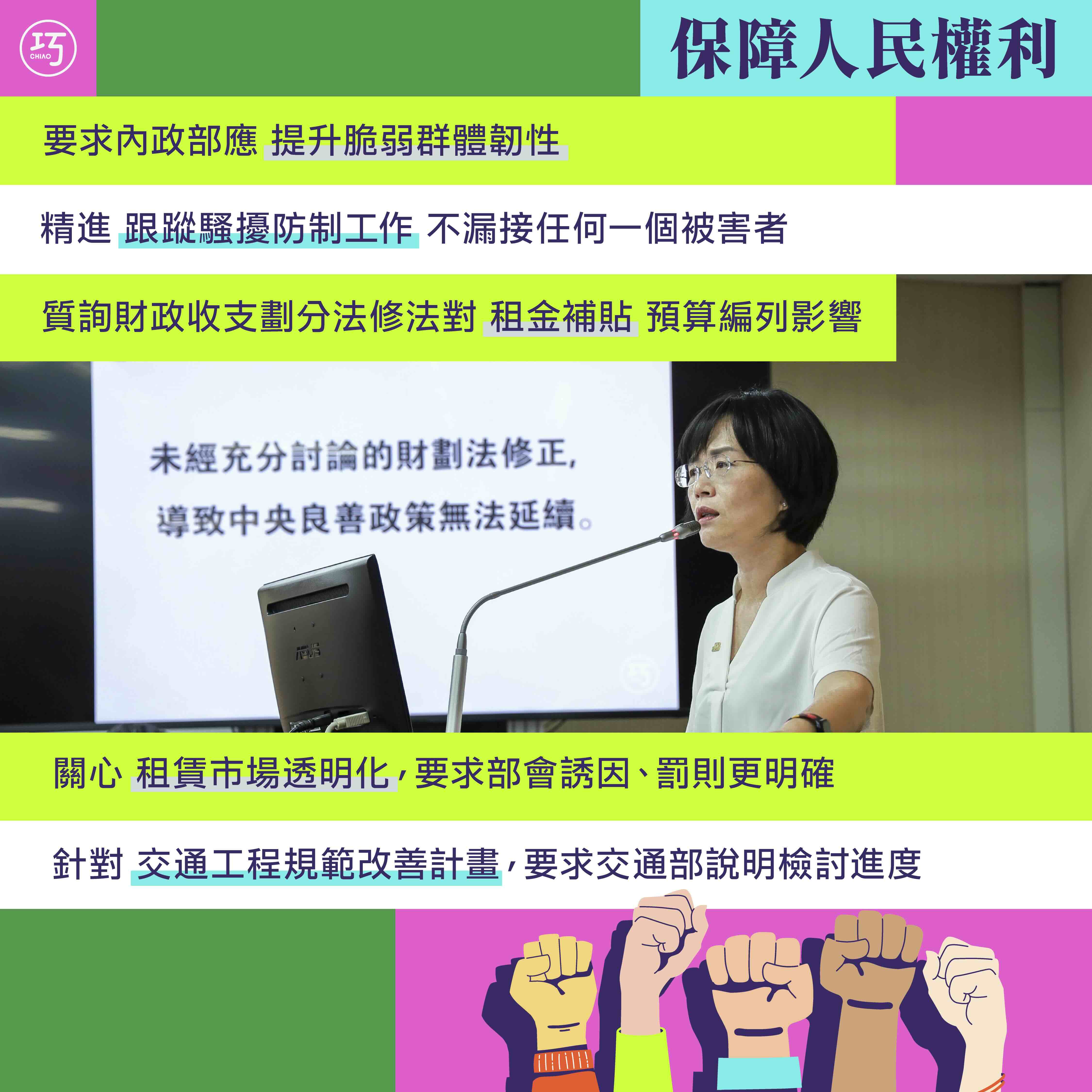今年五月,針對行政院提出《因應國際情勢強化經濟社會及國土安全韌性特別條例》草案。因應地緣政治與國際情勢下,我在委員會關心內政部在條例中具體的工作項目與預算,同時我也強調針對特別條例第三條的工作項目中,除了加強國土防衛能量、提升資工作業環境及設備外,內政部也應該加強照顧弱勢族群及提供關懷服務的政策。「韌性」是指應對與適應外在條件變化的考驗中,人民維持正常生活的能力,而照顧脆弱群體當然也是社會韌性的一環,政府的政策也應優先考量風險承擔與應對能力較弱的群體照顧。