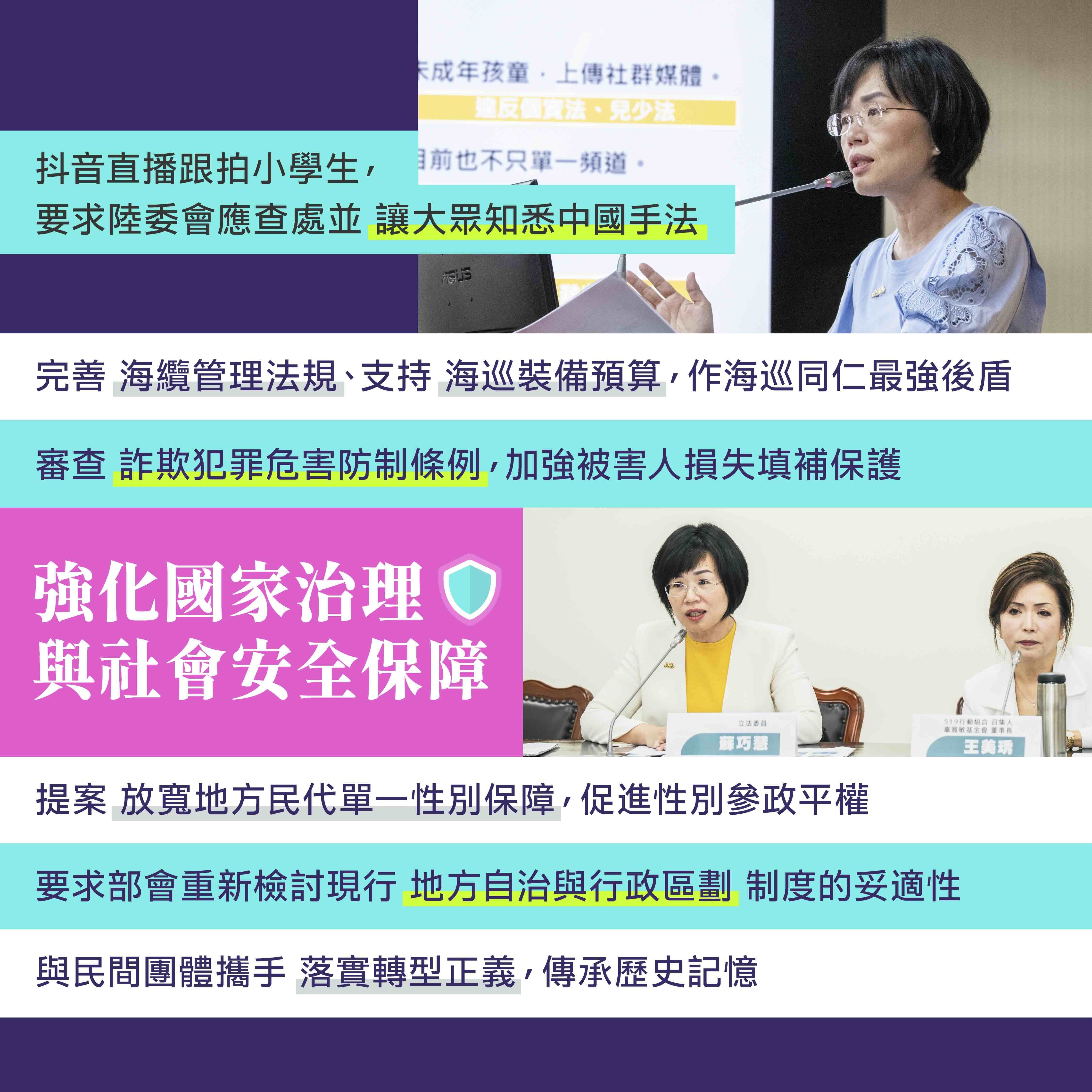 我和多位委員共同提案修改地方制度法第33條,從過去「1/4婦女保障名額」,改為「代表名額在三人以上者,應有任一性別當選名額一人」,避免應選名額三人以下的小選區中,容易發生只有單一性別代表的情形,一步步讓台灣走向性別平等、多元共榮的社會。