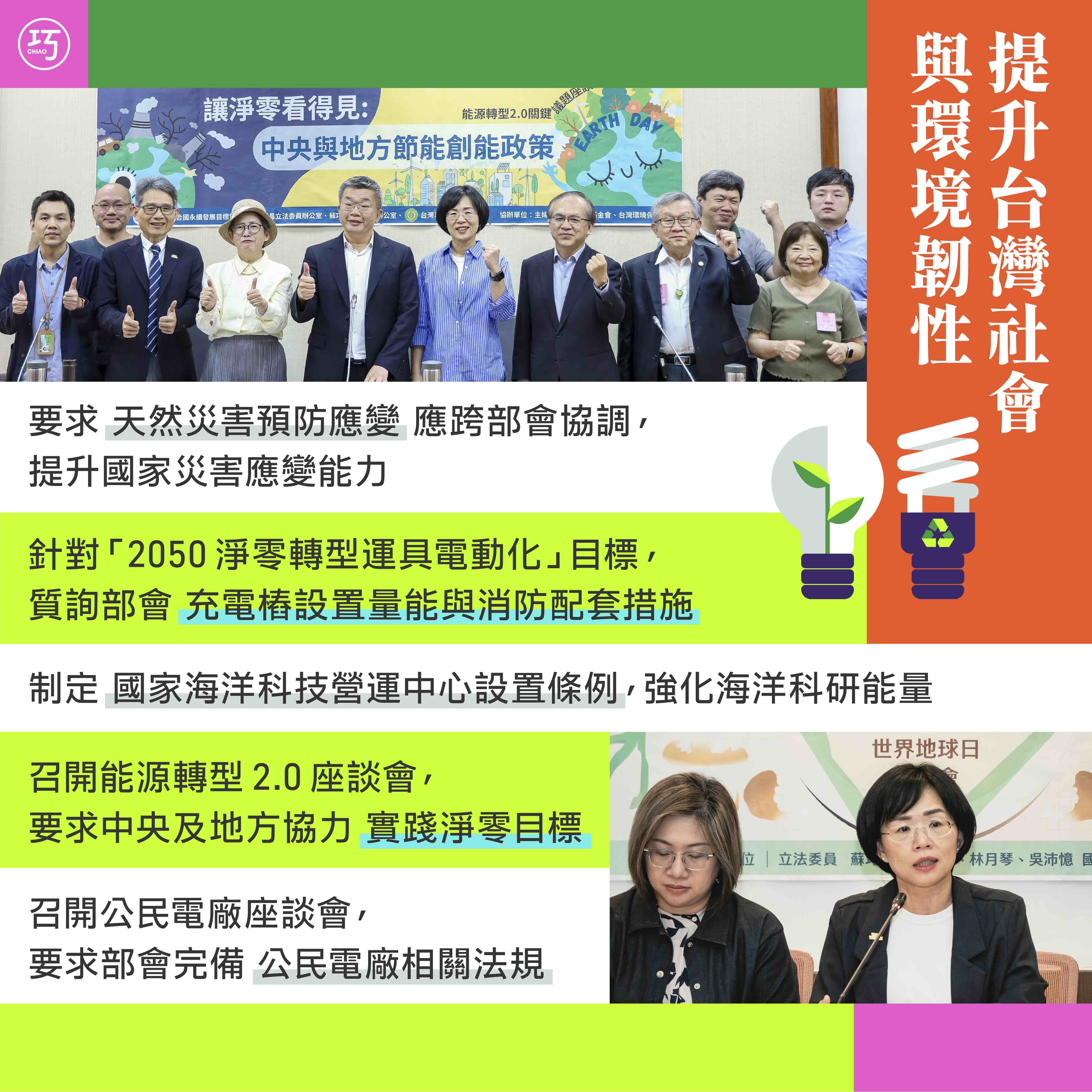雖然各地方政府已依《氣候變遷因應法》設置負責協調、整合的單位,但部分縣市的自治條例仍缺乏具體中期減碳目標或規劃。因此,我擔任副會長的立法院聯合國永續發展目標策進會再次召開座談會,邀集各中央及地方代表,希望強化政策對接,讓資訊整合、資源妥善分配,攜手實踐淨零目標!