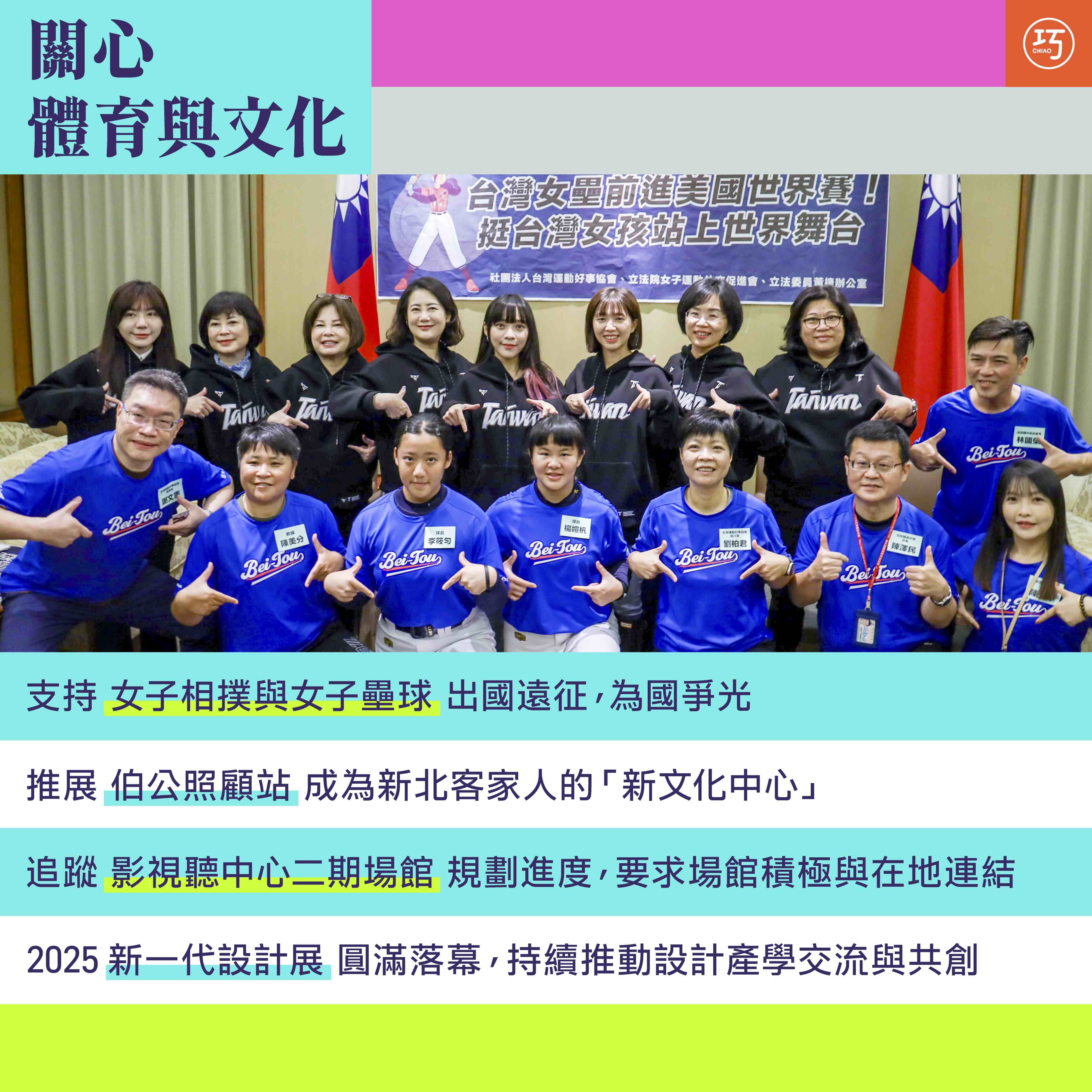 身為立法院女子運動外交促進會副會長,我一直非常支持女性在運動場域發光發熱,過去曾參與過女子棒球體驗營、女性體壇攝影大賽,甚至是足球女孩計畫,不但大力推廣基層運動,更希望打破運動與性別的刻板印象。我也參與女子相撲選手與北投國中女子壘球為國出征記者會,希望透過記者會,讓社會各界給女子運動更大的支持與鼓勵,讓他們能順利出賽並獲取佳績,我願做最好的後盾,給予在備賽和參賽期間更多的協助。