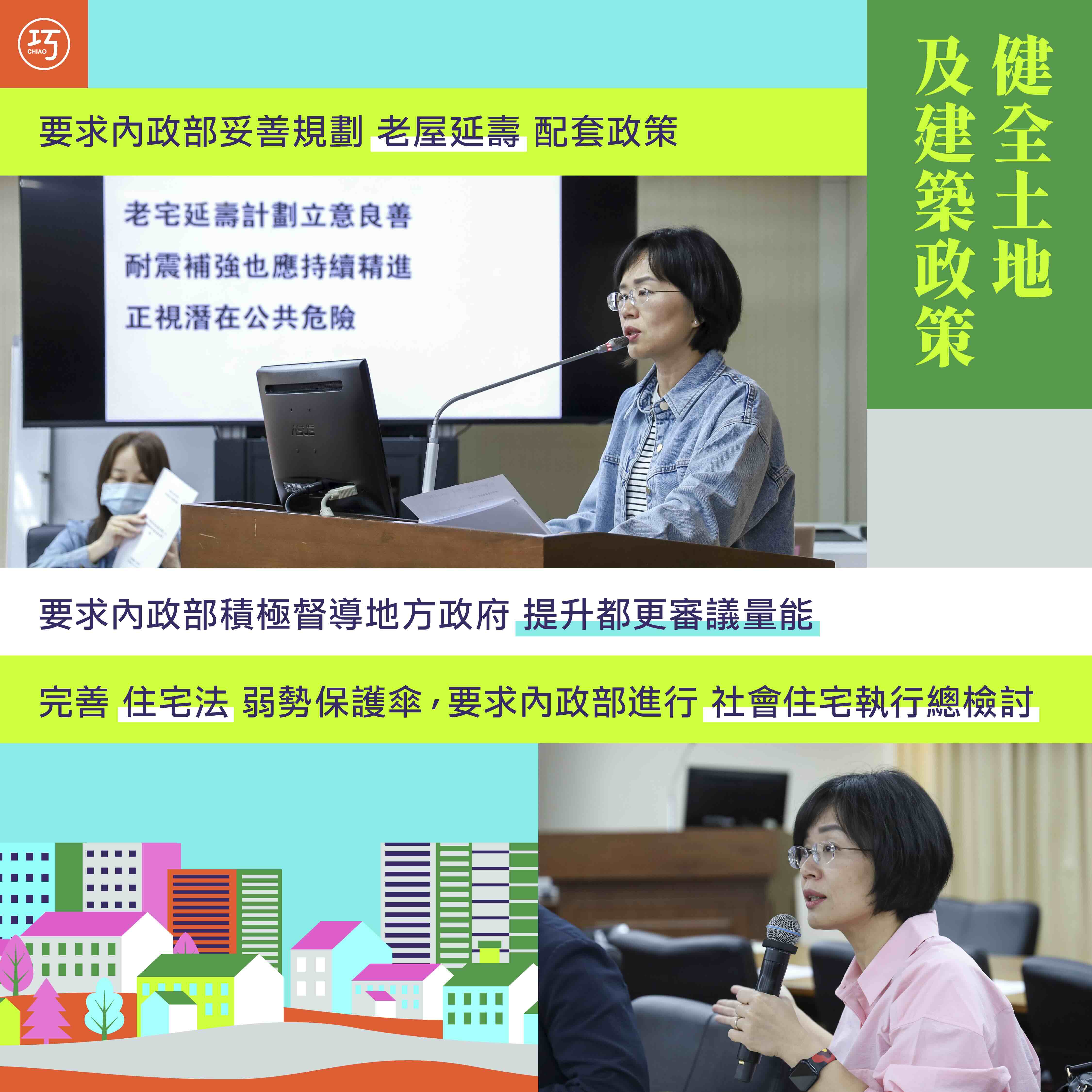 台灣社會面臨「人屋雙老」的問題,內政部規劃利用《強化經濟社會及國土安全韌性特別條例》三年50億來推動老宅延壽計畫 ,改善4-6樓集合住宅的屋況。我認同內政部關照老宅議題的精神,但也提醒部長,台灣老宅的樣態非常多,計畫未來若推展順利,也應擴大辦理,讓其他類型的老宅也能受惠。