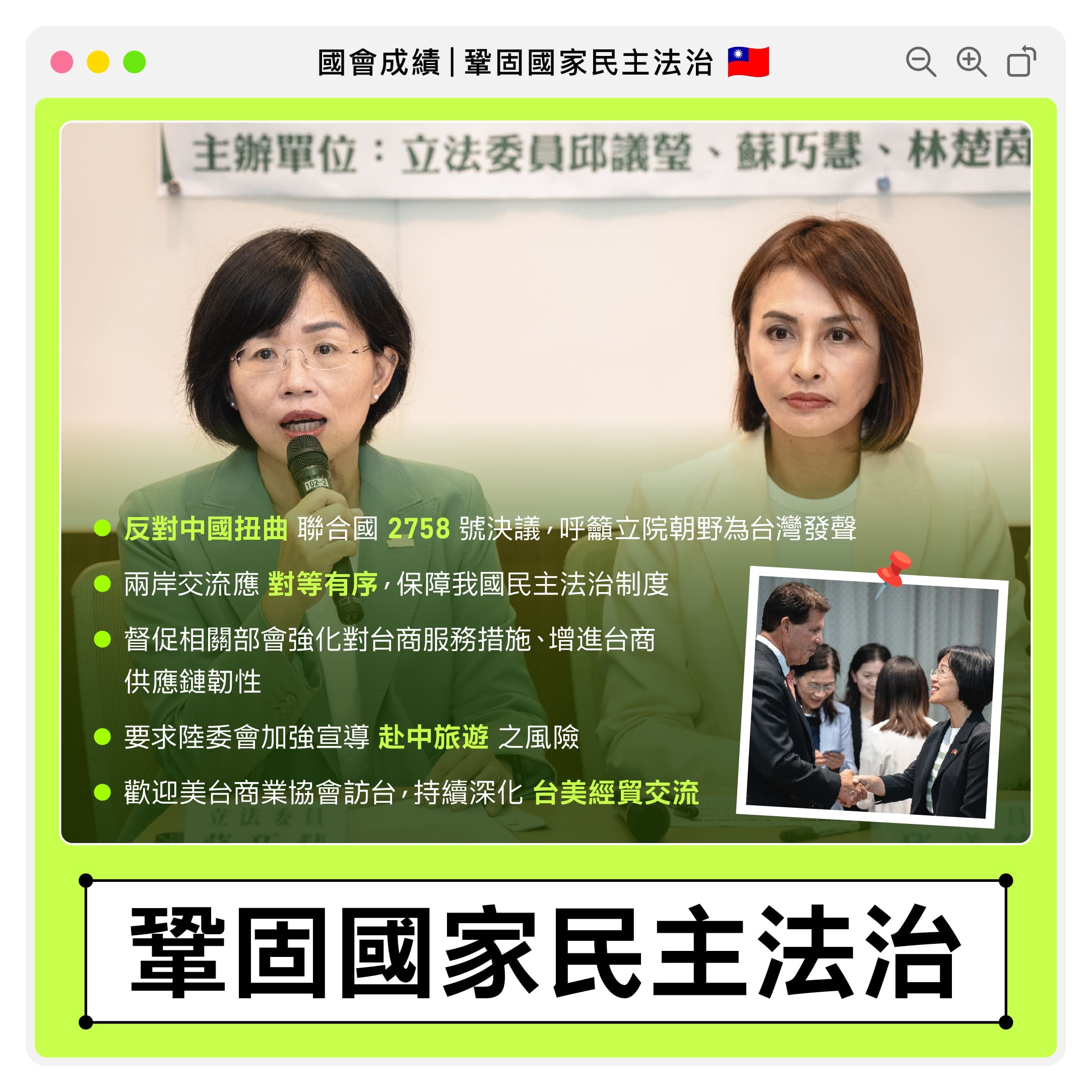聯合國2758號決議雖然指出,國際上的「中國代表」是中華人民共和國;但是這份決議既不牽涉台灣議題、未曾討論台灣民眾由誰統治,更從來沒有提到台灣是中國的一部份!然而,中國長期片面擴張解釋2758號決議,試圖否認台灣在國際上地位的做法,對台灣的衝擊擴大到每一個層面,所幸國際社會挺台的力道從未減縮,從2023年美國眾議院通過台灣國際團結法案,到2024年澳洲與荷蘭國會,都以高度共識拒絕中國扭曲聯合國大會第2758號決議,我也在邱議瑩、林楚茵、沈伯洋委員的號召下,共同在立法院簽署2758不涉及台灣決議,呼籲立法院不分黨派,應該一同為台灣在國際發聲!