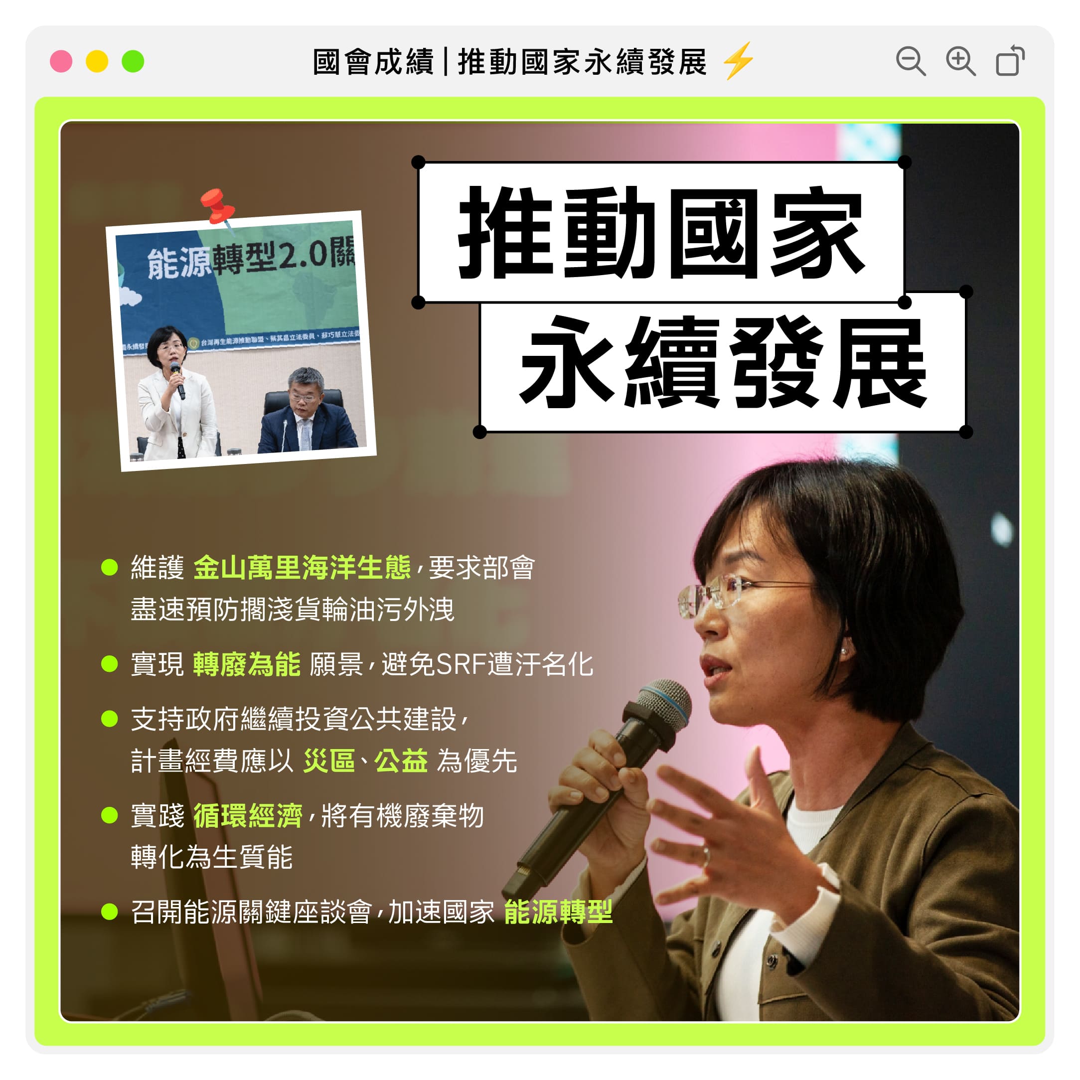 立法院聯合國永續發展目標策進會和社團法人台灣再生能源推動聯盟共同舉辦能源轉型2.0座談會。近年產業用電增加的同時,我們也必須持續邁向2050淨零碳排,因此「再生能源」就扮演著更重要的角色。無論是我十分關心的生質能燃料,或是極有潛力的地熱發電,這些都仰賴政府及民間更多合作開發!政府會積極開發新能源,包括地熱、小水力、生質能、海洋能等多元綠能,我也會繼續在能源轉型這項重要的議題上努力,並且推動相關法案及政策,打造綠色永續的台灣!