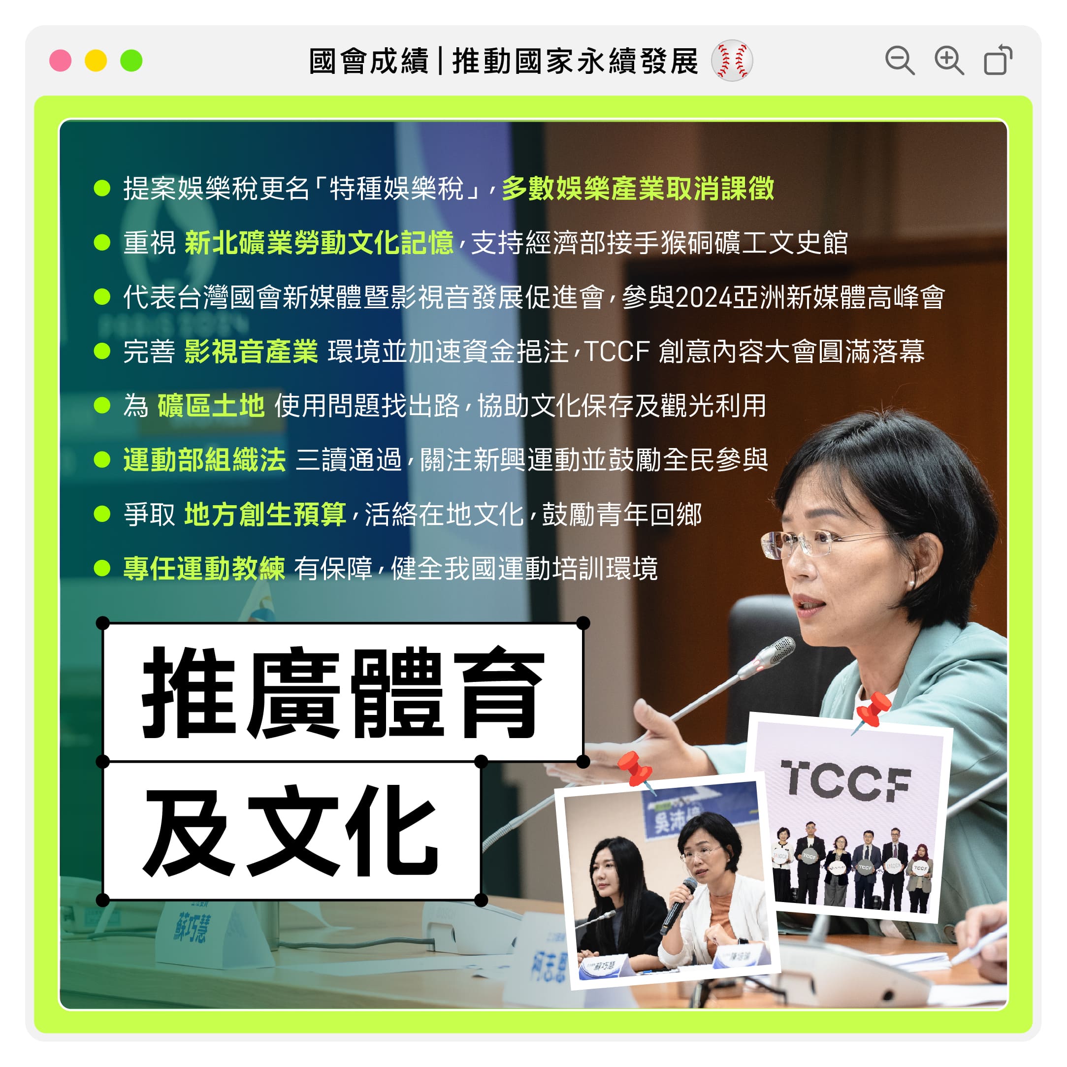 我上任立委以來,一直在各個體育項目上為大家爭取更好的資源,在樹林、鶯歌、新莊,我爭取了各級學校運動場館的整建翻新,也協助鶯歌工商女排隊,民安國小棒壘球隊、福營國中棒球隊、鶯歌國中籃球隊獲得更多出國、與不同國家的好手切磋的機會,另也在2019年成功協調體育舞蹈總會成立霹靂舞委員會,讓新興的運動項目有能有所組織、有自己的預算、可以做自己的決策。民進黨政府執政期間,體育經費從2016的80億元翻倍至2024年的160億元,也將培養社會廣泛運動風氣列入重點工作,本會期立法院通過「運動部組織法」,我也參與相關公聽會表示意見,未來,我會持續就新興運動發展及鼓勵全民參與,並壯大運動產業,讓全世界因為運動認識台灣!