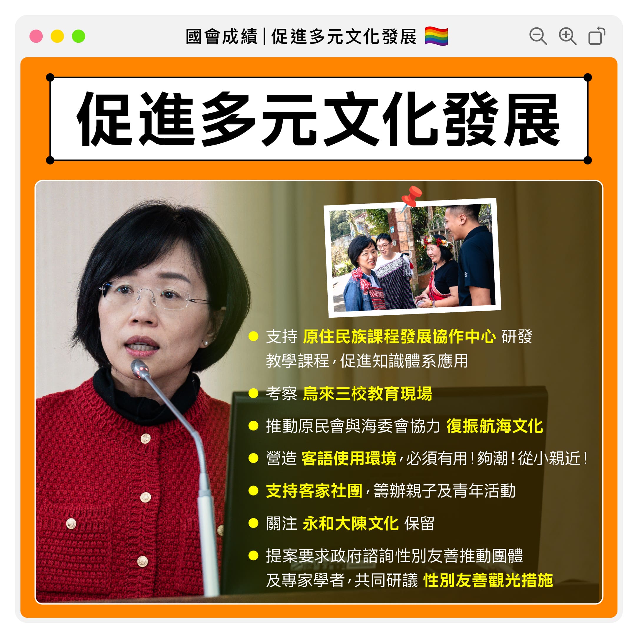 我國觀光資源豐沛,為促使我國觀光產業打造性別友善環境,不僅消極的不違法、不歧視、不排斥,更促使服務提供者能積極提供性別友善措施的協助與支持,使多元性別主體能於觀光旅途中館受安全自在,因此,我在交通委員會提案並獲得通過,除要求領隊人員課程研議加入一定時數的性別友善課程,也要求政府諮詢性別友善推動學者及團體,共同研議性別友善觀光措施,並請地方政府共同投入!