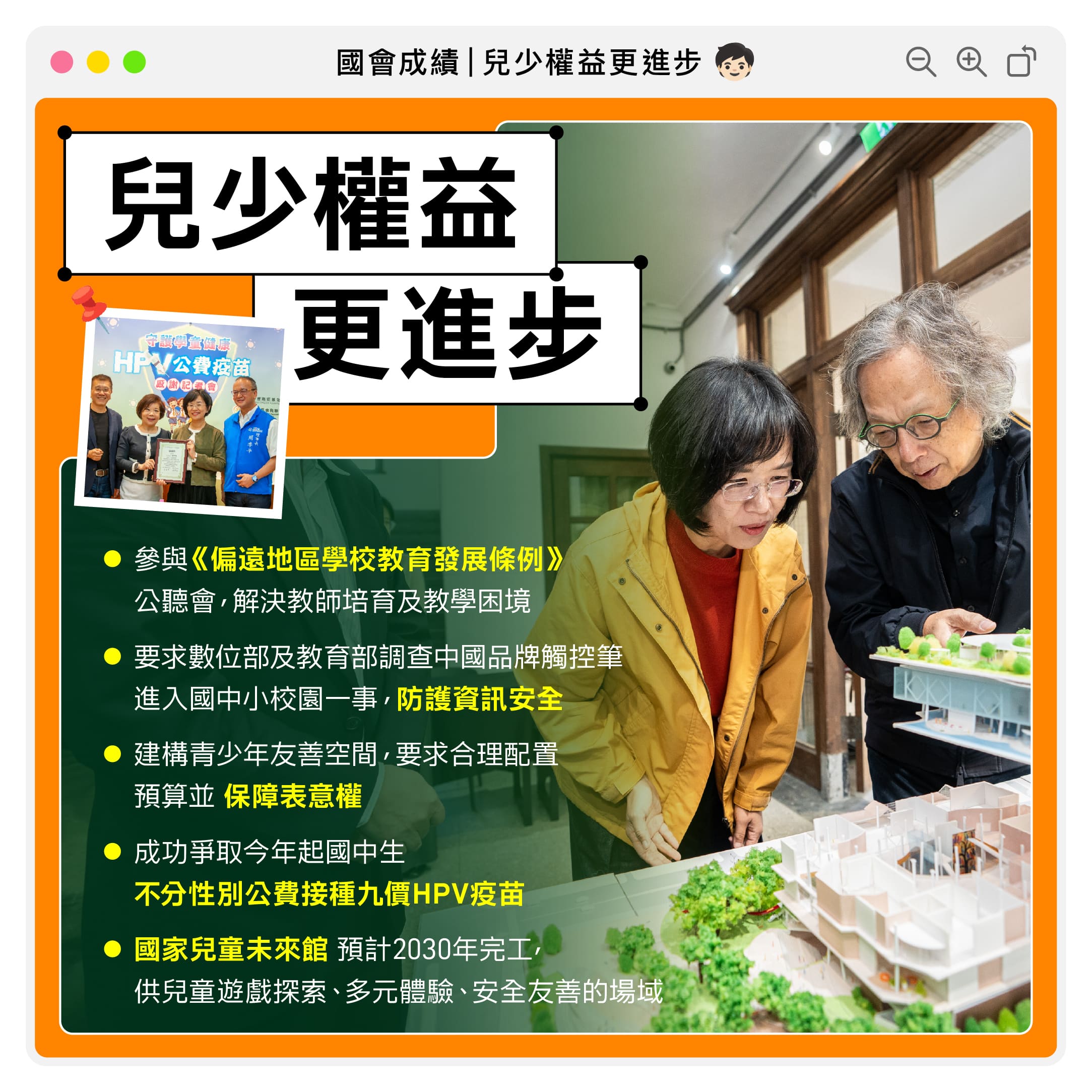 板橋車站旁有一塊大空地,現作為停車場使用,在行政院時任蘇貞昌院長的推動,成功在2021年獲得行政院核定通過,打造全台第一座專屬兒童的國際級地標「國家兒童未來館」!目前規劃,從地下冒險洞穴,開闊的空廊,到二、三樓的風之城和水之領域,甚至是空中花園,場館的每一層樓都融合了不同的自然元素,「讓孩子們在樹下讀書」不再是城市中的奢求,而是可以實踐的夢想,而我們的夢想就是可以讓孩子們安心、快樂成長!國家兒童未來館預計2030年完工,我會持續追蹤。