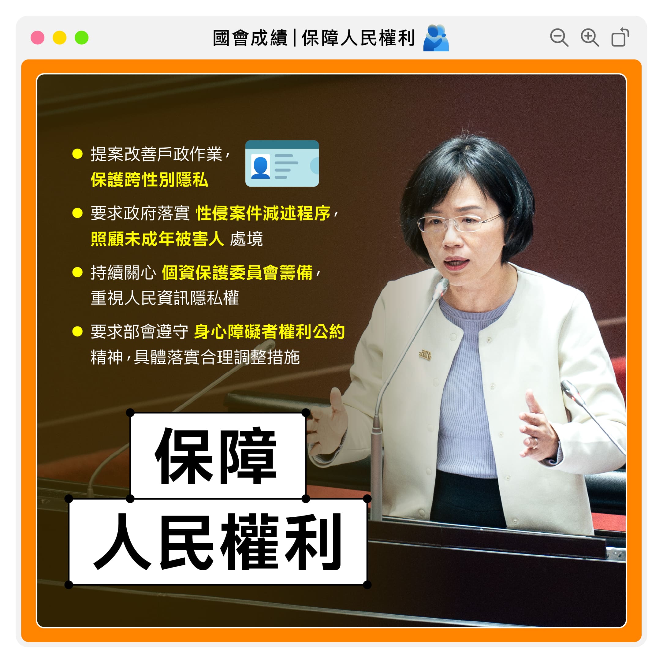 過去跨性別族群的戶籍謄本中會記載性別變更的情事,使當事人處於非自願暴露的風險中。經當事人和相關團體倡議後,內政部通函各戶政機關,讓跨性別者申請於戶籍資料換登時得不轉載性別變更的情事。近期我收到陳情,性別變更當事人的弟妹戶口名簿中仍會逕行記載當事人出生別變更的情況,讓跨性別者的隱私可能在非自願情況下被洩漏。因此我在預算提案中要求讓關係人比照當事人,請內政部通函各地方戶政事務所,主動告知性別變更的關係人得申請換登戶籍資料,不予記載其家人出生別變更記事。