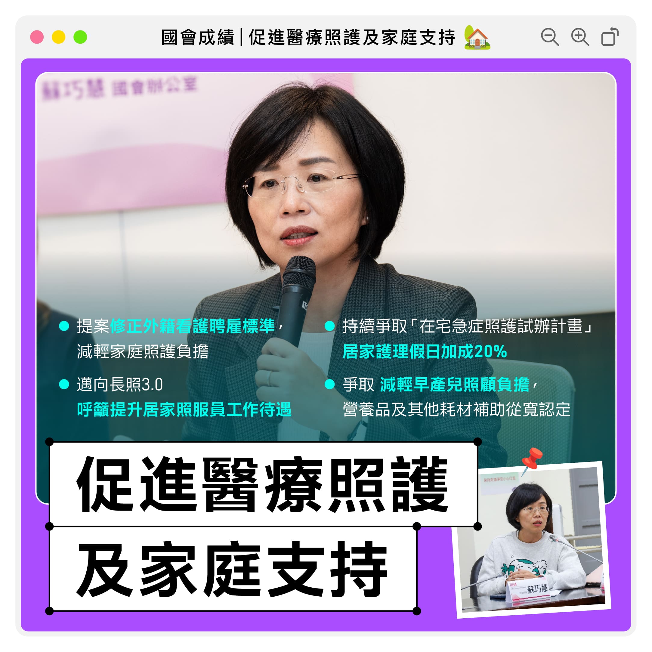 「全民健康保險在宅急症照護試辦計畫」2024年7月1日開辦,該計畫依賴護理師到宅提供服務,但居家護理給付卻十年未調,尤其在假日期間,願意提供居家護理人力更少。我在衛環委員會多次提案要求提高健保給付,健保署也將提高給付提案列入2024年12月26日共擬會議,提案居家護理假日加成20%!我也會持續追蹤,希望能有好結果,給辛苦的護理人員一個溫暖!