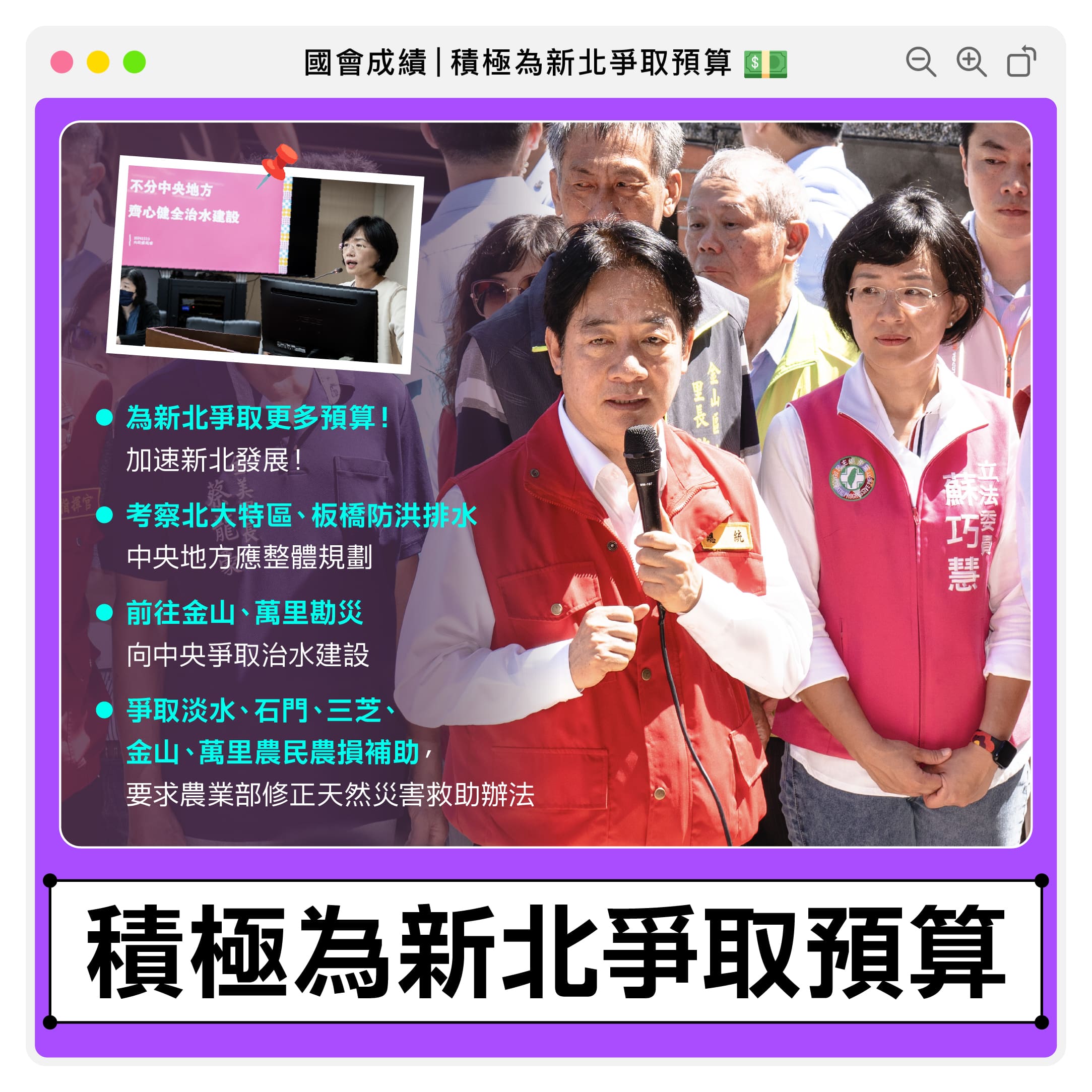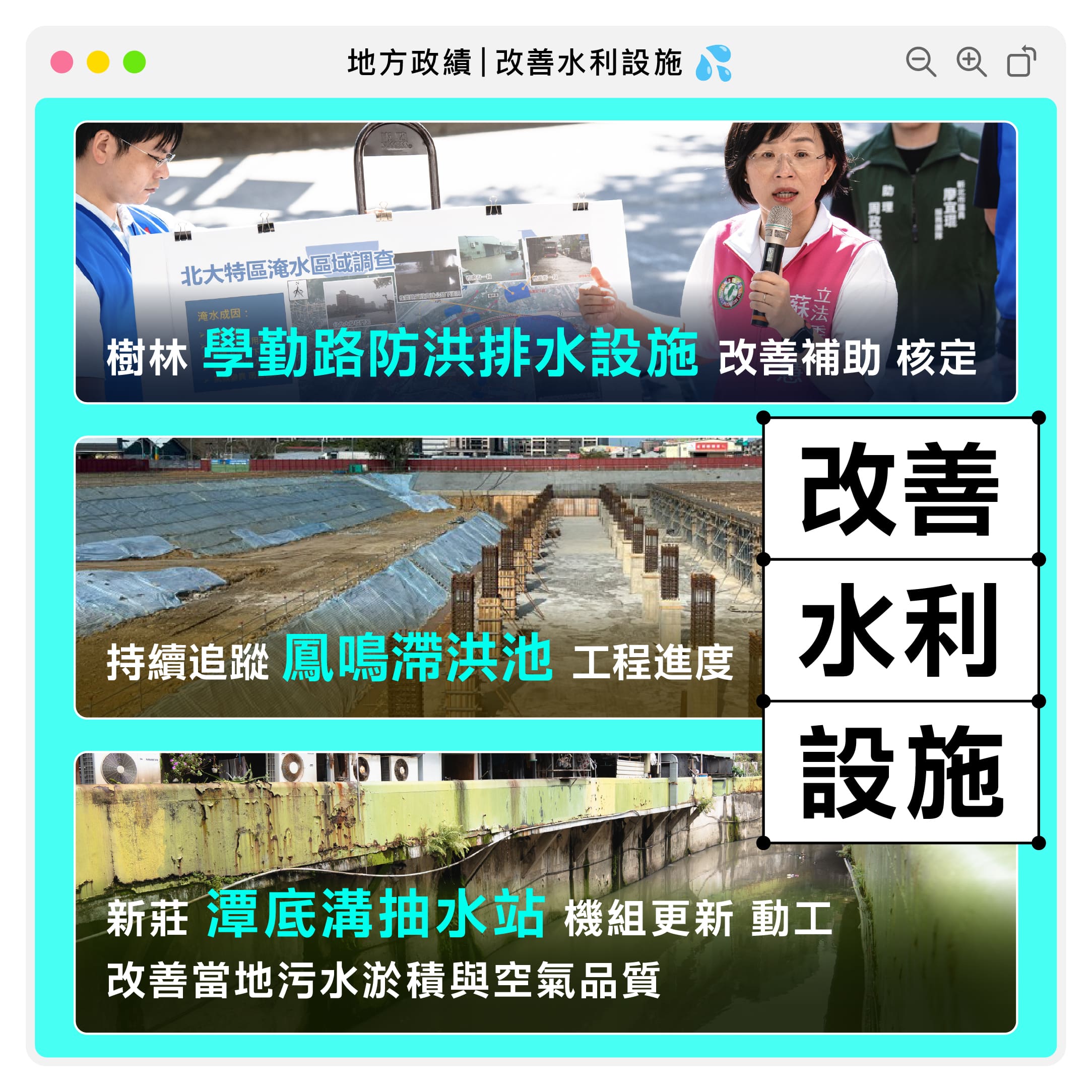 氣候變遷帶來的極端降雨型態更凸顯水利設施的重要。我在任內也持續爭取滯洪池的設置、抽水站機組的更新,以及整體的區域防洪排水設施改善,讓城市面臨天災時能更具韌性!