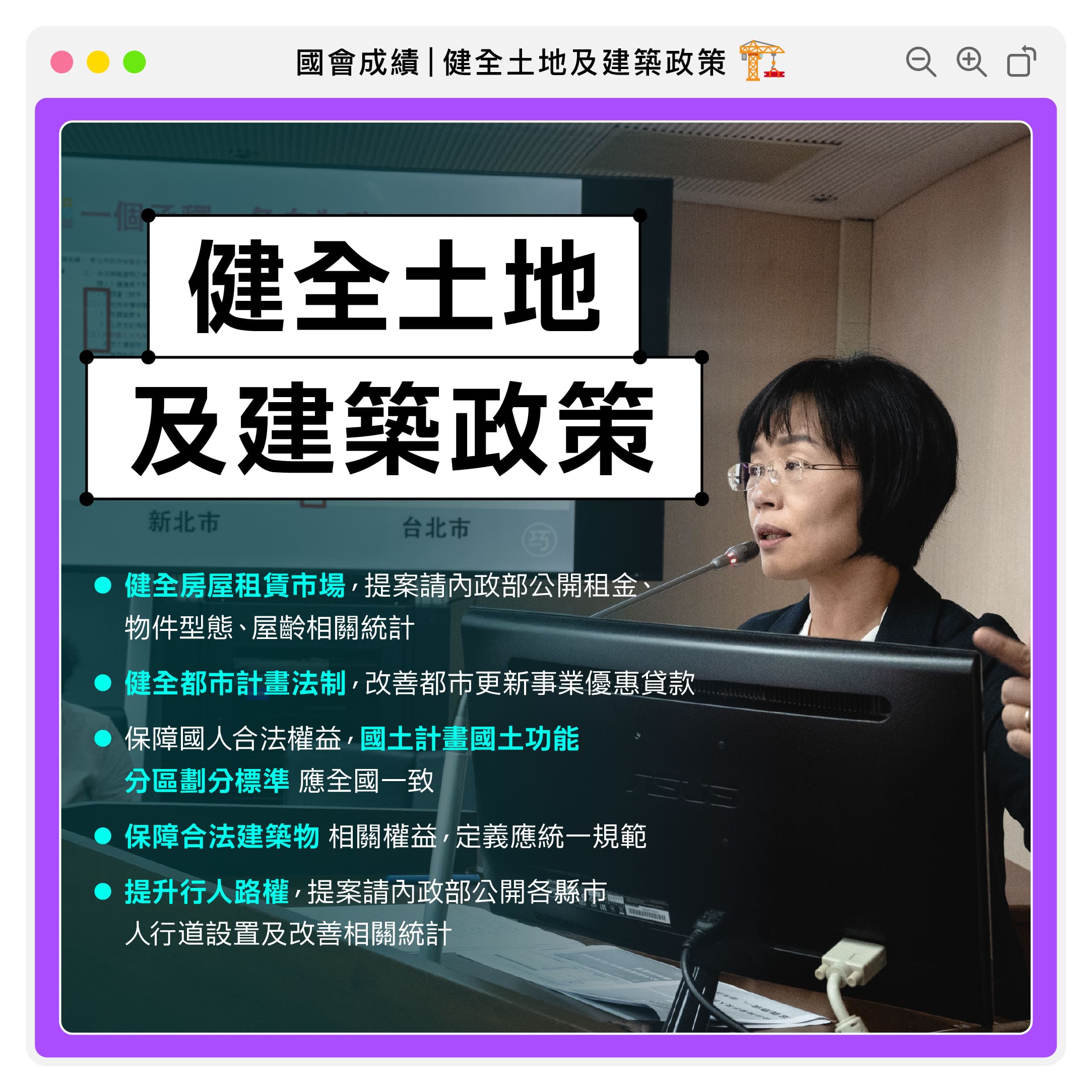 合法建築物的定義涉及人民的重大權益,舉凡都市更新是否能獲得租稅優惠、老屋修繕是否能申請補助等等,都需要是合法建築物才能享有保障。但遍查與建築管理相關的法規如建築法、住宅法等,都並未明確定義,而是只有內政部近25年前的函釋。各縣市也對合法建築物的定義各自有不同的規定。我主張定義應由法律統一規範,讓全國人民有所適從。