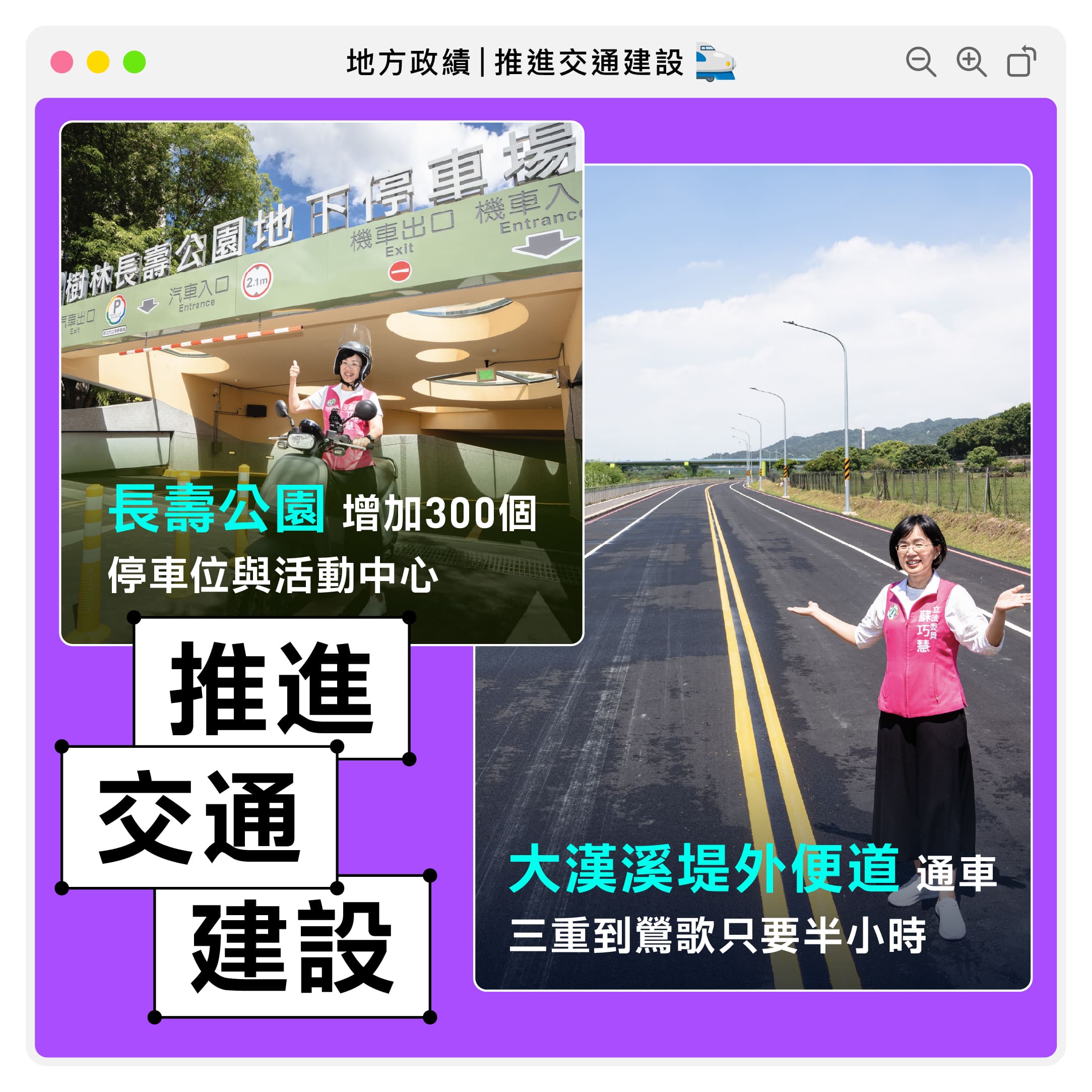便捷的交通是提升生活品質和發展地方的重要關鍵,面對地方鄉親所期盼的交通需求與問題癥結,我都逐一思考新解方、爭取中央資源、監督過程及確保工程品質,努力不間斷,成績看得見!