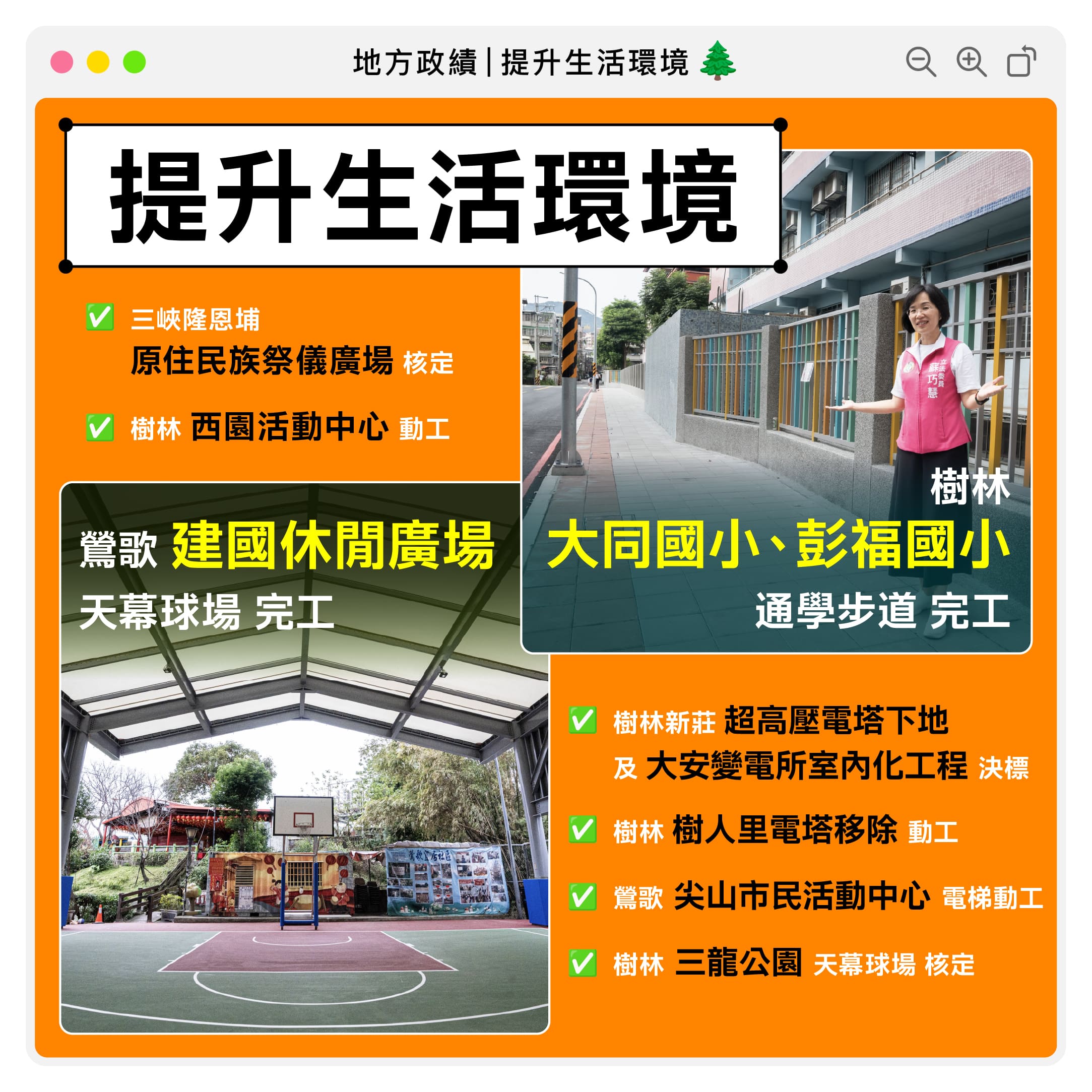我非常重視鄉親生活及休憩的環境,無論是平常在行走的步行環境、提供日常休憩的公園、及讓大家參與聚會的活動中心和集會所,這都是我在任內積極爭取及改善的,我會持續努力,讓鄉親的生活環境能夠更舒適、更便利!